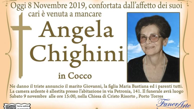 Ne danno il triste annuncio il marito Giovanni, la figlia Maria Bastiana ed i parenti tutti. La camera ardente è allestita presso l’abitazione in via Petronia, 141. Il funerale avrà luogo sabato 9 novembre alle ore 15, nella chiesa di Cristo risorto a Porto Torres.