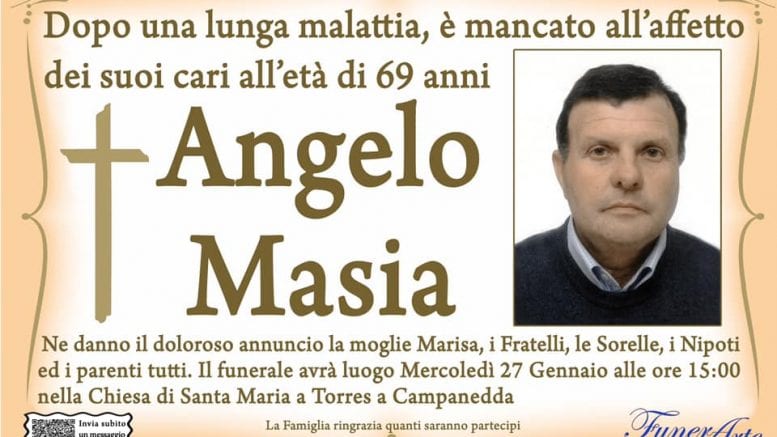Ne danno il doloroso annuncio la moglie Marisa, i fratelli, le sorelle, i nipoti ed i parenti tutti. Il funerale avrà luogo mercoledì 27 gennaio alle ore 15 nella chiesa di Santa Maria a Torres in Campanedda a Sassari.