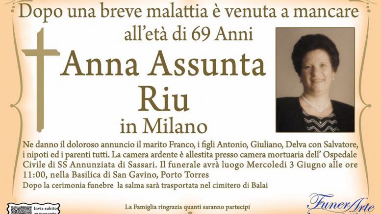 Ne danno il doloroso annuncio il marito Franco, i figli Antonio, Giuliano, Delva con Salvatore, i nipoti ed i parenti tutti. La camera ardente è allestita presso la camera mortuaria dell’ospedale civile Santissima Annunziata di Sassari. Il funerale avrà luogo mercoledì 3 giugno alle ore 11, nella basilica di San Gavino a Porto Torres.