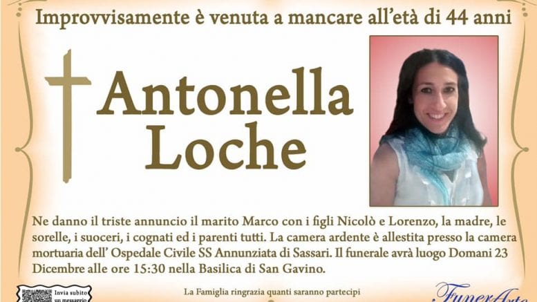 Ne danno il triste annuncio il marito Marco con i figli Nicolò e Lorenzo, la madre, le sorelle, i suoceri, i cognati ed i parenti tutti. La camera ardente è allestita presso la camera mortuaria dell’ospedale civile Santissima Annunziata di Sassari.