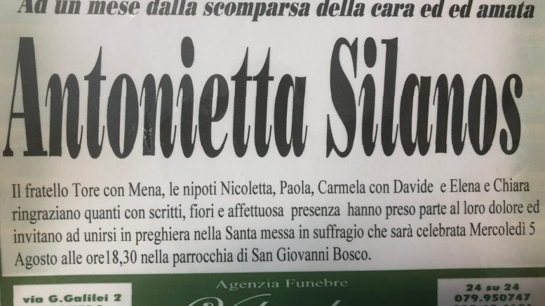 Il fratello Tore con Mena, le nipoti Nicoletta, Paola, Carmela con Davide e Elena e Chiara ringraziano quanti con scritti, fiori e affettuosa presenza hanno preso parte al loro dolore ed invitano ad unirsi in preghiera nella Santa Messa di suffragio che sarà celebrata mercoledì 5 agosto alle ore 18:30 nella parrocchia di San Giovanni Bosco ad Alghero.