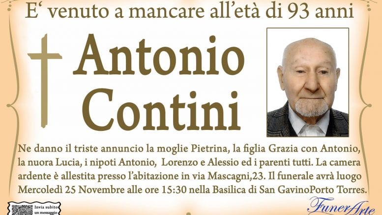 Ne danno il triste annuncio la moglie Pietrina, la figlia Grazia con Antonio, la nuora Lucia, i nipoti Antonio, Lorenzo e Alessio ed i parenti tutti. La camera ardente è allestita presso l’abitazione in via Mascagni, 23 a Porto Torres. Il funerale avrà luogo mercoledì 25 novembre alle ore 15:30 nella basilica di San Gavino a Porto Torres.