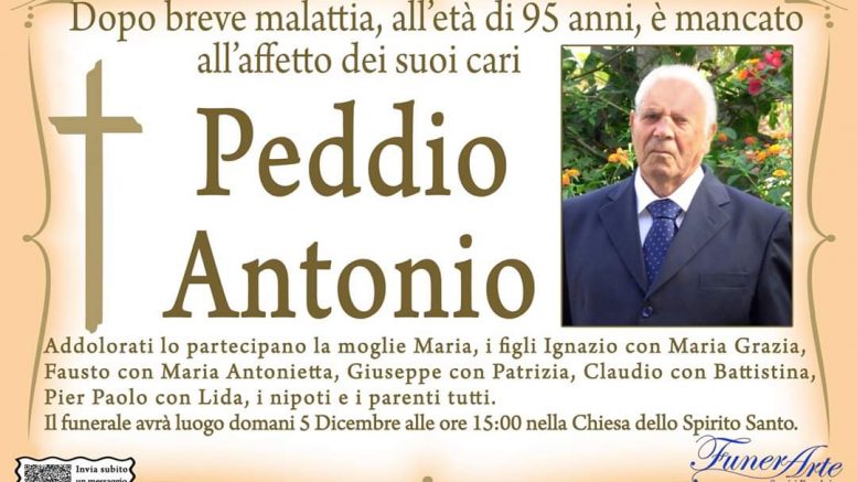 Addolorati lo partecipano la moglie Maria, i figli Ignazio con Maria Grazia, Fausto con Maria Antonietta, Giuseppe con Patrizia, Claudio con Battistina, Pier Paolo con Lisa, i nipoti e i parenti tutti.