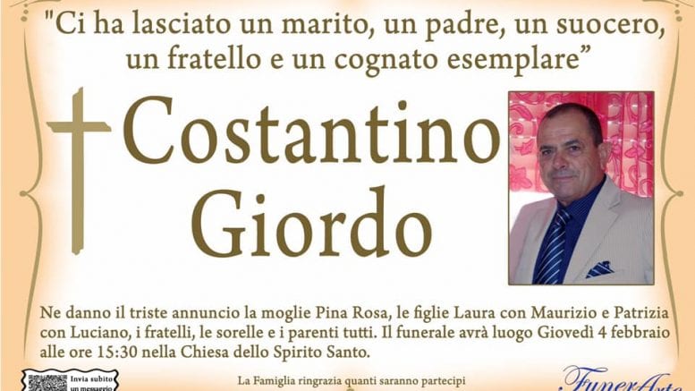 Ne danno il triste annuncio la moglie Pina Rosa, le figlie Laura con Maurizio e Patrizia con Luciano, i fratelli, le sorelle e i parenti tutti. Il funerale avrà luogo giovedì 4 febbraio alle ore 15:30 nella chiesa dello Spirito Santo a Porto Torres.