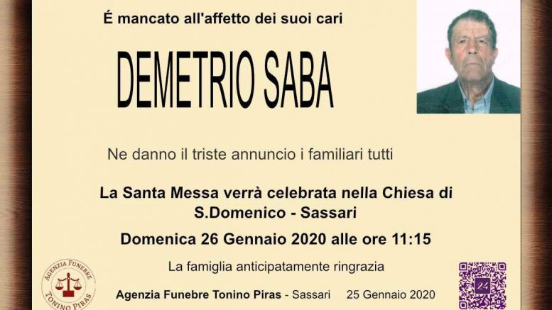 E’ mancato all’affetto dei suoi cari Demetrio Saba. Ne danno il triste annuncio i familiari tutti.