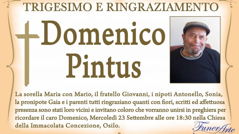 La sorella Maria con Mario, il fratello Giovanni, i nipoti Antonello, Sonia, la pronipote Gaia e i parenti tutti ringraziano quanti con fiori, scritti ed affettuosa presenza sono stati loro vicini e invitano coloro che vorranno unirsi in preghiera per ricordare il caro Domenico, mercoledì 23 settembre alle ore 18:30 nella chiesa dell’Immacolata Concezione a Osilo.