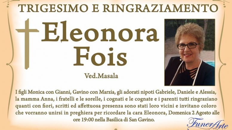 I figli Monica con Gianni, Gavino con Marzia, gli adorati nipoti Gabriele, Daniele e Alessia, la mamma Anna, i fratelli e le sorelle, i cognati e le cognate e i parenti tutti ringraziano quanti con fiori, scritti ed affettuosa presenza sono stati loro vicini e invitano coloro che vorranno unirsi in preghiera per ricordare la cara Eleonora, domenica 2 agosto alle ore 19 nella basilica di San Gavino a Porto Torres.
