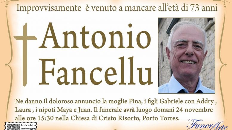 Ne danno il doloroso annuncio la moglie Pina, i figli Gabriele con Addry, Laura, i nipoti Maya e Juan. Il funerale avrà luogo oggi 24 novembre alle 15:30 nella chiesa di Cristo Risorto a Porto Torres.