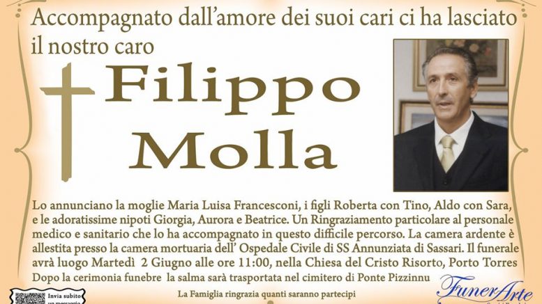 Lo annunciano la moglie Maria Luisa Francesconi, i figli Roberta con Tino, Aldo con Sara, e le adoratissime nipoti Giorgia, Aurora e Beatrice. Un ringraziamento particolare al personale medico e sanitario che lo ha accompagnato in questo difficile percorso. La camera ardente è allestita presso la camera mortuaria dell’ospedale civile Santissima Annunziata di Sassari. Il funerale avrà luogo martedì 2 giugno alle ore 11, nella chiesa di Cristo Risorto a Porto Torres.