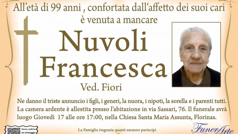 Ne danno il triste annuncio i figli, i generi, la nuora, i nipoti, la sorella e i parenti tutti. La camera ardente è allestita presso l’abitazione in via Sassari, 76 a Florinas.