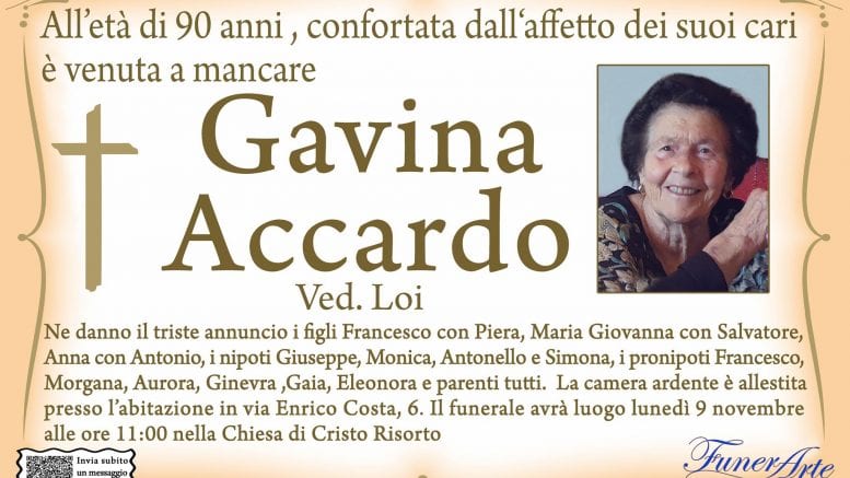 Ne danno il triste annuncio i figli Francesco con Piera, Maria Giovanna con Salvatore, Anna con Antonio, i nipoti Giuseppe, Monica, Antonello e Simona, i pronipoti Francesco, Morgana, Aurora, Ginevra, Gaia, Eleonora e parenti tutti. La camera ardente è allestita presso l’abitazione in via Enrico Costa, 6 a Porto Torres. Il funerale avrà luogo lunedì 9 novembre alle ore 11 nella chiesa di Cristo Risorto a Porto Torres.