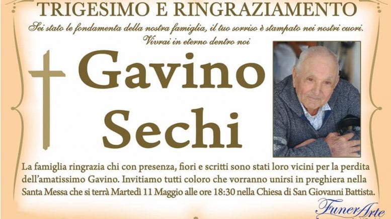 La famiglia ringrazia chi con presenza, fiori e scritti sono stati loro vicini per la perdita dell’amatissimo Gavino. Invitiamo tutti coloro che vorranno unirsi in preghiera nella Santa Messa che si terrà martedì 11 maggio alle ore 18:30 nella chiesa di San Giovanni Battista a Sassari.