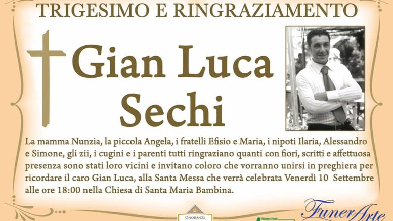 La mamma Nunzia, la piccola Angela, i fratelli Efisio e Maria, i nipoti Ilaria, Alessandro e Simone, gli zii, i cugini e i parenti tutti ringraziano quanti con fiori, scritti e affettuosa presenza sono stati loro vicini e invitano coloro che vorranno unirsi in preghiera per ricordare il caro Gianluca, alla Santa Messa che verrà celebrata venerdì alle ore 18 nella chiesa di Santa Maria bambina a Sassari.
