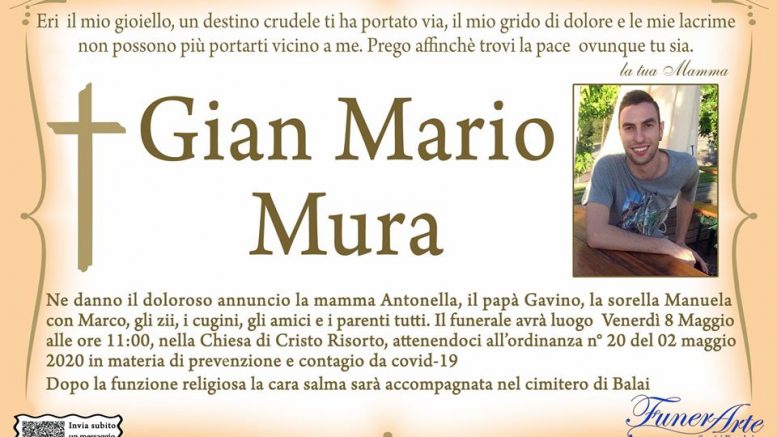 Ne danno il doloroso annuncio la mamma Antonella, il papà Gavino, la sorella Manuela con Marco, gli zii, i cugini, gli amici e i parenti tutti. Il funerale avrà luogo venerdì 8 maggio alle ore 11 nella chiesa di Cristo Risorto, attenendoci all’ordinanza n° 20 del 2 maggio 2020 in materia di prevenzione e contagio da Covid-19.