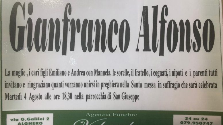 La moglie, i cari figli Emiliano e Andrea con Manuela, le sorelle, il fratello, i cognati, i nipoti e i parenti tutti invitano e ringraziano quanti vorranno unirsi in preghiera nella Santa Messa in suffragio che sarà celebrata martedì 4 agosto alle ore 18:30 nella parrocchia di San Giuseppe ad Alghero.