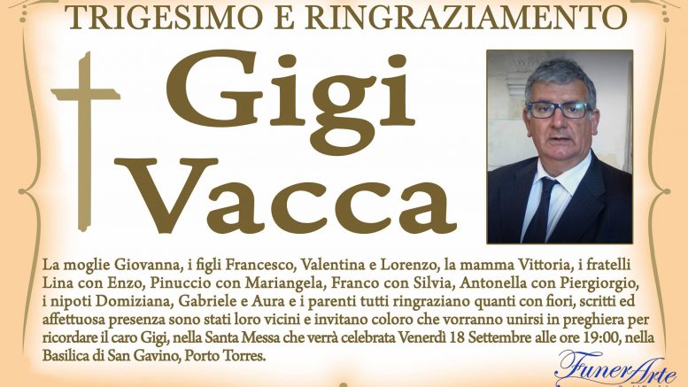 La moglie Giovanna, i figlie Francesco, Valentina e Lorenzo, la mamma Vittoria, i fratelli Lina con Enzo, Pinuccio con Mariangela, Franco con Silvia, Antonella con Piergiorgio, i nipoti Domiziana, Gabriele e Aura e i parenti tutti ringraziano quanti con fiori, scritti ed affettuosa presenza sono stati loro vicini e invitano coloro che vorranno unirsi in preghiera per ricordare il caro Gigi, nella Santa Messa che verrà celebrata venerdì 18 settembre alle ore 19, nella basilica di San Gavino a Porto Torres.