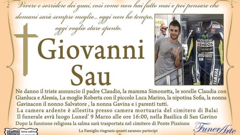 Ne danno il triste annuncio il padre Claudio, la mamma Simonetta, le sorelle Claudia con Gianluca e Alessia, la moglie Roberta con il piccolo Luca Marino, la nipotina Sofia, la nonna Gavina con il nonno Salvatore, la nonna Gavina e i parenti tutti.