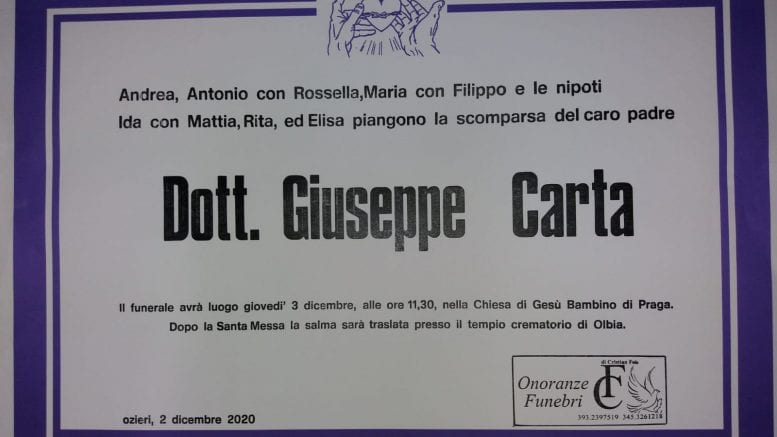 Il funerale avrà luogo giovedì 3 dicembre, alle ore 11:30, nella chiesa di Gesù Bambino di Praga ad Ozieri. Dopo la Santa Messa la salma sarà traslata presso il tempio crematorio di Olbia.