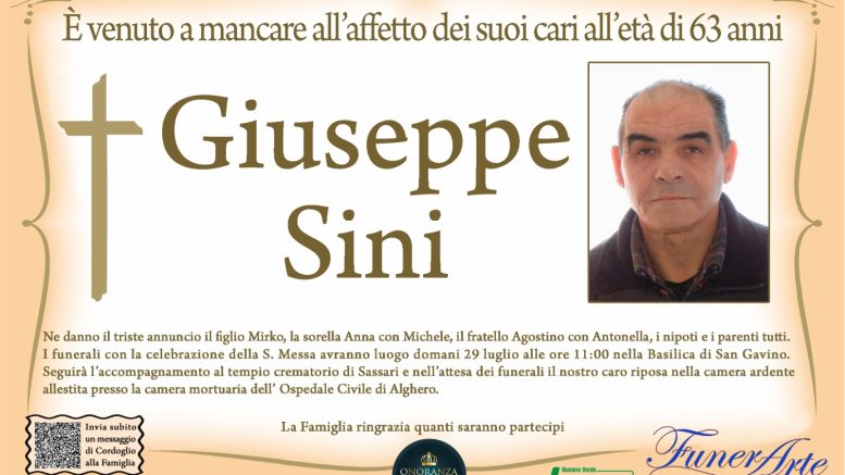 I funerali con la celebrazione della Santa Messa avranno luogo venerdì alle ore 11 nella basilica di San Gavino a Porto Torres. Seguirà l’accompagnamento al tempio crematorio di Sassari e nell’attesa dei funerali il nostro caro riposa nella camera ardente allestita presso la camera mortuaria dell’ospedale civile di Alghero.