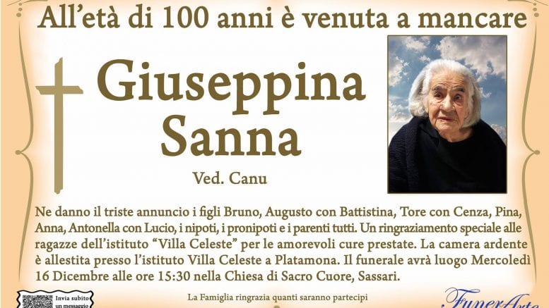 Ne danno il triste annuncio i figli Bruno, Augusto con Battistina, Tore con Cenza, Pina, Anna, Antonella con Lucio, i nipoti, i pronipoti e i parenti tutti. Un ringraziamento speciale alle ragazze dell’istituto “Villa Celeste” per le amorevoli cure prestate. La camera ardente è allestita presso l’istituto Villa Celeste a Platamona.