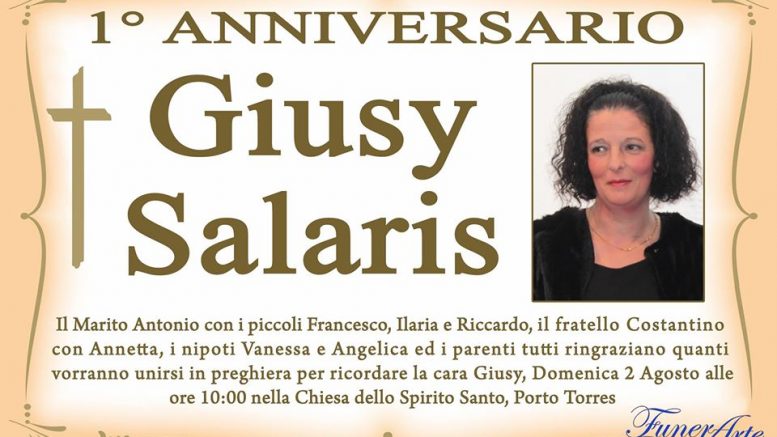 Il marito Antonio con i piccoli Francesco, Ilaria e Riccardo, il fratello Costantino con Annetta, i nipoti Vanessa e Angelica ed i parenti tutti ringraziano quanti vorranno unirsi in preghiera per ricordare la cara Giusy, domenica 2 agosto alle ore 10 nella chiesa dello Spirito Santo a Porto Torres.