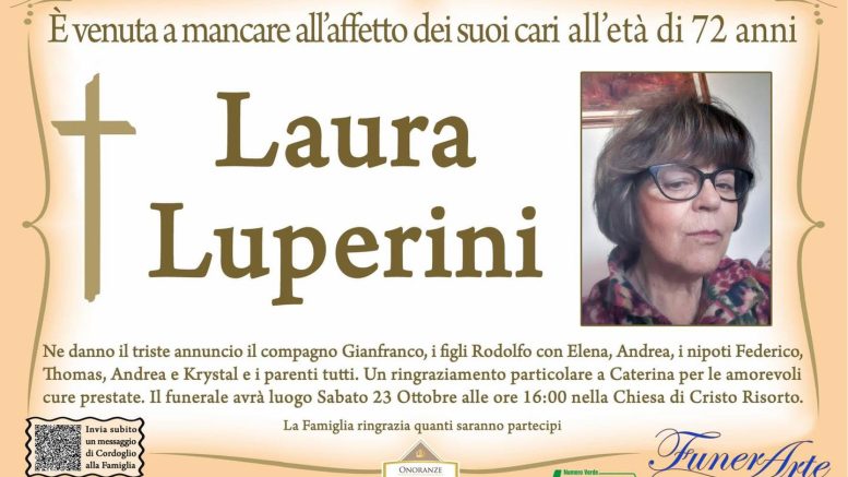 Ne danno il triste annuncio il compagno Gianfranco, i figli Rodolfo con Elena, Andrea, i nipoti Federico, Thomas, Andrea e Krystal e i parenti tutti. Un ringraziamento particolare a Caterina per le amorevoli cure prestate.