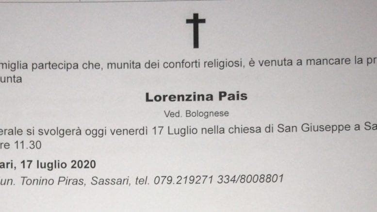 Il funerale si svolgerà venerdì 17 luglio nella chiesa di San Giuseppe a Sassari alle ore 11:30.