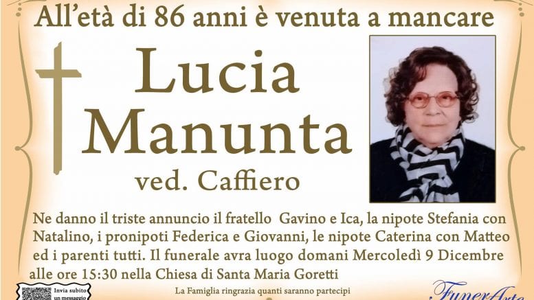 Ne danno il triste annuncio il fratello Gavino e Ica, la nipote Stefania con Natalino, i pronipoti Federica e Giovanni, la nipote Caterina con Matteo ed i parenti tutti.