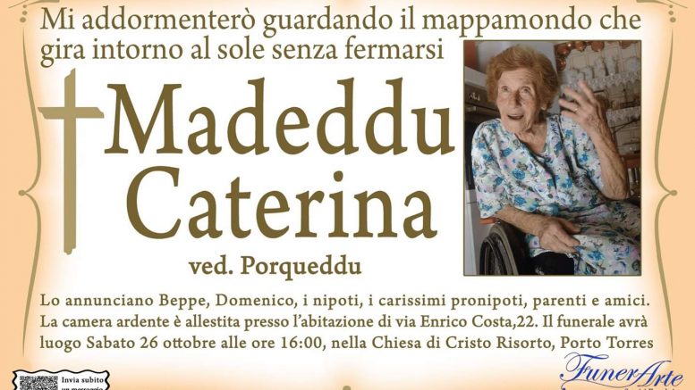 Lo annunciano Beppe, Domenico, i nipoti, i carissimi pronipoti, parenti e amici. La camera ardente è allestita presso l’abitazione di via Enrico Costa, 22. Il funerale avrà luogo sabato 26 ottobre alle ore 16, nella chiesa di Cristo risorto, Porto Torres.