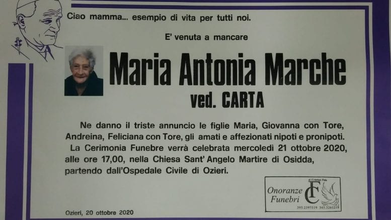 La cerimonia funebre verrà celebrata mercoledì 21 ottobre 2020, alle ore 17, nella chiesa di Sant’Angelo martire a Osidda (Nu), partendo dall’ospedale civile di Ozieri.