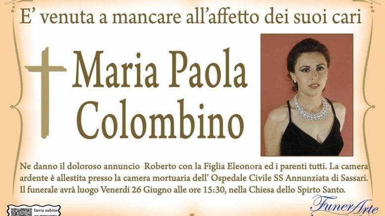 Ne danno il doloroso annuncio Roberto con la figlia Eleonora ed i parenti tutti. La camera ardente è allestita presso la camera mortuaria dell’ospedale civile Santissima Annunziata di Sassari. Il funerale avrà luogo venerdì 26 giugno alle ore 15:30, nella chiesa dello Spirito Santo a Porto Torres.