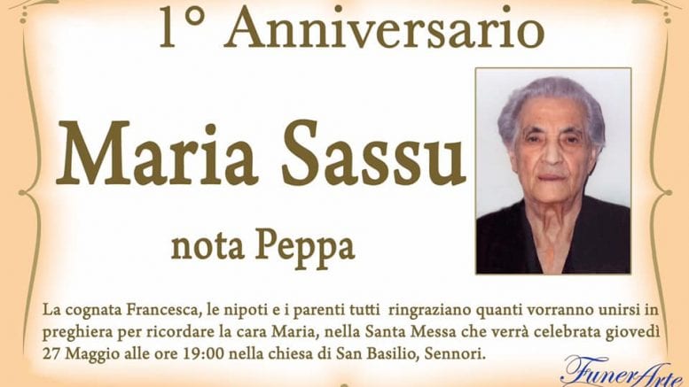 La cognata Francesca, le nipoti e i parenti tutti ringraziano quanti vorranno unirsi in preghiera per ricordare la cara Maria, nella Santa Messa che verrà celebrata giovedì 27 maggio alle ore 19 nella chiesa di San Basilio a Sennori.