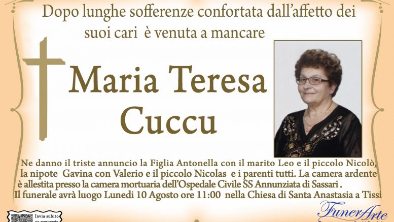 Ne danno il triste annuncio la figlia Antonella con il marito Leo e il piccolo Nicolò, la nipote Gavina con Valerio e il piccolo Nicolas e i parenti tutti. La camera ardente è allestita presso la camera mortuaria dell’ospedale civile Ss. Annunziata di Sassari.