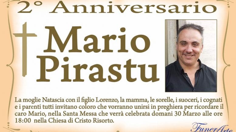 La moglie Natascia con il figlio Lorenzo, la mamma, le sorelle, i suoceri, i cognati e i parenti tutti invitano coloro che vorranno unirsi in preghiera per ricordare il caro Mario, nella Santa Messa che verrà celebrata martedì 30 marzo alle ore 18 nella chiesa di Cristo Risorto a Porto Torres.