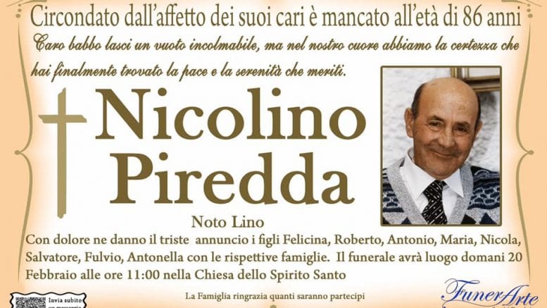 Con dolore ne danno il triste annuncio i figli Felicina, Roberto, Antonio, Maria, Nicola, Salvatore, Fulvio, Antonella con le rispettive famiglie. Il funerale avrà luogo sabato 20 febbraio alle ore 11 nella chiesa dello Spirito Santo a Porto Torres.