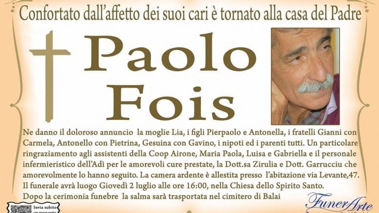 Ne danno il doloroso annuncio la moglie Lia, i figli Pierpaolo e Antonella, i fratelli Gianni con Carmela, Antonello con Pietrina, Gesuina con Gavino, i nipoti ed i parenti tutti. Un particolare ringraziamento agli assistenti della Coop Airone, Maria Paola, Luisa e Gabriella e il personale infermieristico dell’Adì per le amorevoli cure prestate, la dott.ssa Zirulia e dott. Garrucciu che amorevolmente lo hanno seguito. La camera ardente è allestita presso l’abitazione in via Levante, 47 a Porto Torres. Il funerale avrà luogo giovedì 2 luglio alle ore 16, nella chiesa dello Spirito Santo.