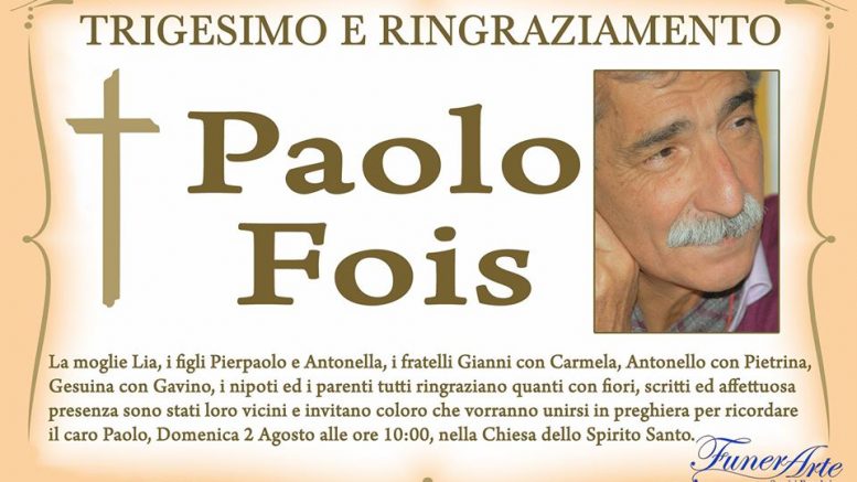 La moglie Lia, i figli Pierpaolo e Antonella, i fratelli Gianni con Carmela, Antonello con Pietrina, Gesuina con Gavino, i nipoti ed i parenti tutti ringraziano quanti con fiori, scritti ed affettuosa presenza sono stato loro vicini e invitano coloro che vorranno unirsi in preghiera per ricordare il caro Paolo, domenica 2 agosto alle ore 10, nella chiesa dello Spirito Santo a Porto Torres.