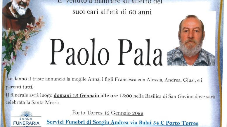 E’ venuto a mancare all’affetto dei suoi cari all’età di 60 anni Paolo Pala. Ne danno il triste annuncio la moglie Anna, i figli Francesca con Alessia, Andrea, Giusi, e i parenti tutti.