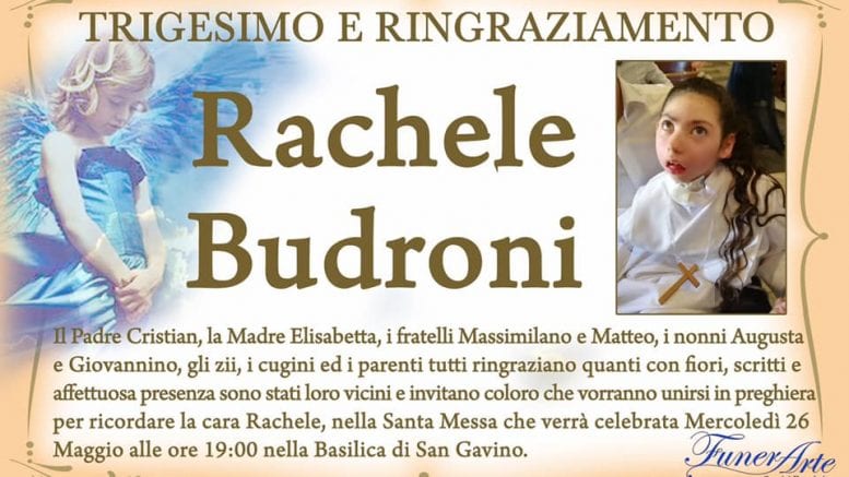 Il padre Cristian, la madre Elisabetta, i fratelli Massimiliano e Matteo, i nonni Augusta e Giovannino, gli zii, i cugini ed i parenti tutti ringraziano quanti con fiori, scritti e affettuosa presenza sono stati loro vicini e invitano coloro che vorranno unirsi in preghiera per ricordare la cara Rachele, nella Santa Messa che verrà celebrata mercoledì 26 maggio alle ore 19 nella basilica di San Gavino a Porto Torres.