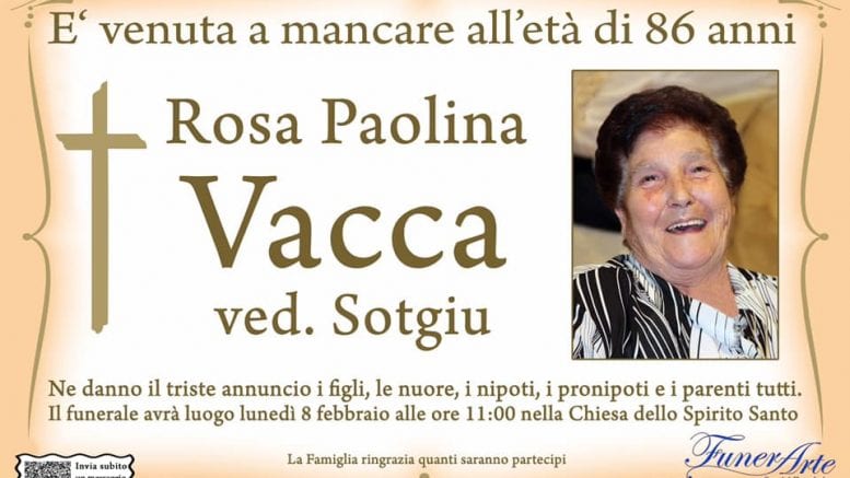 Ne danno il triste annuncio i figli, le nuore, i nipoti, i pronipoti e i parenti tutti. Il funerale avrà luogo lunedì 8 febbraio alle ore 11 nella chiesa dello Spirito Santo a Porto Torres.