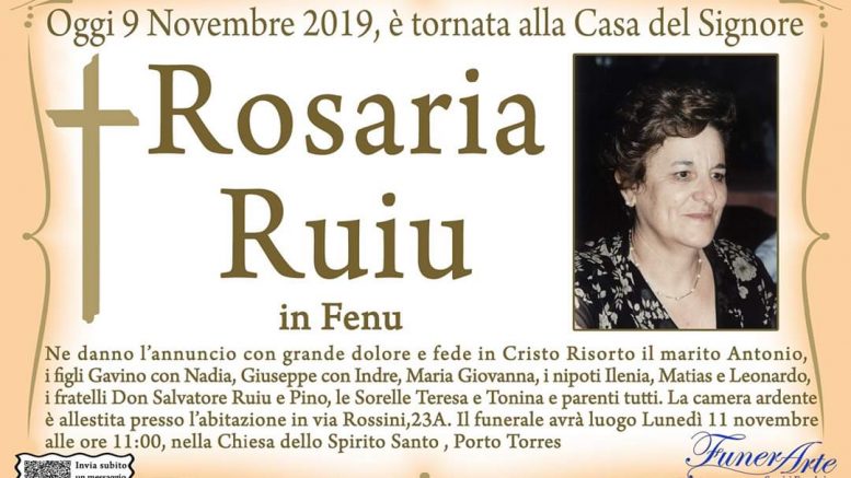 Ne danno l’annuncio con grande dolore e fede in Cristo Risorto il marito Antonio, i figli Gavino con Nadia, Giuseppe con Indre, Maria Giovanna, i nipoti Ilenia, Matias e Leonardo, i fratelli don Salvatore Ruiu e Pino, le sorelle Teresa e Tonina e parenti tutti. La camera ardente è allestita presso l’abitazione in via Rossini, 23/A. Il funerale avrà luogo lunedì 11 novembre alle ore 11, nella chiesa dello Spirito Santo a Porto Torres.