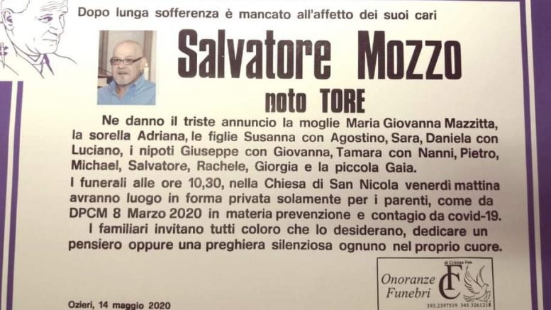 I funerali alle 10:30, nella chiesa di San Nicola venerdì mattina avranno luogo in forma privata solamente per i parenti, come da DPCM 8 Marzo 2020 in materia prevenzione e contagio da Covid-19.