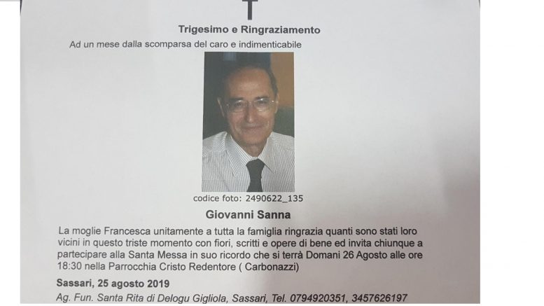 Ad un mese dalla scomparsa del caro e indimenticabile Giovanni Sanna la moglie Francesca unitamente a tutta la famiglia ringrazia quanti sono stati loro vicini in questo triste momento con fiori, scritti e opere di bene ed invita chiunque a partecipare alla Santa Messa in suo ricordo che si terrà il 26 agosto alle ore 18 e 30 nella Parrocchia Cristo Redentore (Carbonazzi).