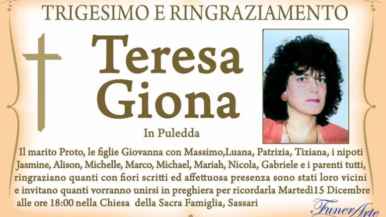 Il marito Proto, le figlie Giovanna con Massimo, Luana, Patrizia, Tiziana, i nipoti Jasmine, Alison, Michelle, Marco, Micheal, Mariah, Nicola, Gabriele e i parenti tutti, ringraziano quanti con fiori, scritti, ed affettuosa presenza sono stati loro vicini e invitano quanti vorranno unirsi in preghiera per ricordarla martedì 15 dicembre alle ore 18 nella chiesa della Sacra Famiglia a Sassari.
