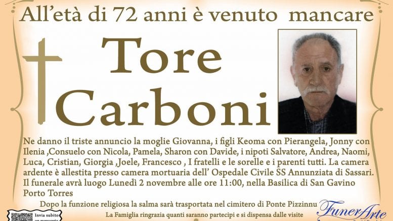 Ne danno il triste annuncio la moglie Giovanna, i figli Keoma con Pierangela, Jonny con Ilenia, Consuelo con Nicola, Pamela, Sharon con Davide, i nipoti Salvatore, Andrea, Naomi, Luca, Cristian, Giorgia, Joele, Francesco, i fratelli e le sorelle e i parenti tutti. La camera ardente è allestita presso la camera mortuaria dell’ospedale civile Santissima Annunziata di Sassari. Il funerale avrà luogo lunedì 2 novembre alle ore 11 nella basilica di San Gavino a Porto Torres.