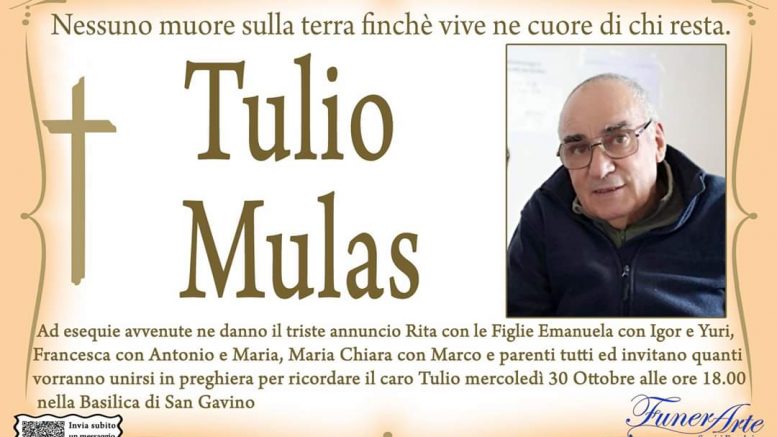 Ad esequie avvenute ne danno il triste annuncio Rita con le figlie Emanuela con Igor e Yuri, Francesca con Antonio e Maria, Maria Chiara con Marco e parenti tutti ed invitano quanti vorranno unirsi in preghiera per ricordare il caro Tulio mercoledì 30 ottobre alle ore 18 nella basilica di San Gavino a Porto Torres.