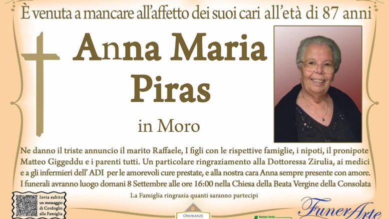 Ne danno il triste annuncio il marito Raffaele, i figli con le rispettive famiglie, i nipoti, il pronipote Matteo Giggeddu e i parenti tutti. Un particolare ringraziamento alla dottoressa Zirulia, ai medici e agli infermieri dell’Adi per le amorevoli cure prestate, e alla nostra cara Anna sempre presente con amore.