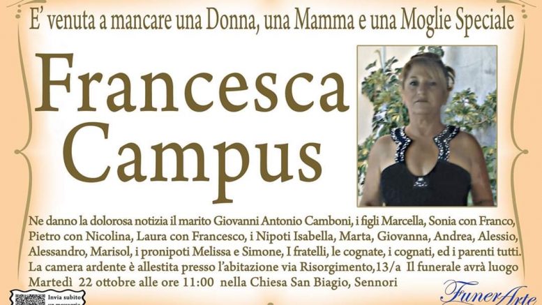 La camera ardente è allestita presso l’abitazione in via Risorgimento, 13/A. Il funerale avrà luogo martedì 22 ottobre alle ore 11 nella chiesa di San Biagio a Sennori.