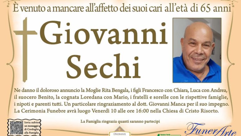 Ne danno il doloroso annuncio la moglie Rita Bengala, i figli Francesco con Chiara, Luca con Andrea, il suocero Benito, la cognata Loredana con Mario, i fratelli e sorelle con le rispettive famiglie, i nipoti e parenti tutti. Un particolare ringraziamento va al dottor Giovanni Manca per il suo impegno.