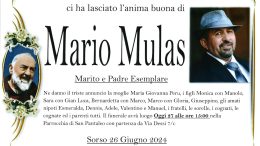 Annuncio mortuario. Circondato dall’affetto dei suoi cari ci ha lasciato l’anima buona diMario MulasMarito e padre esemplareNe danno il triste annuncio la moglie Maria Giovanna…